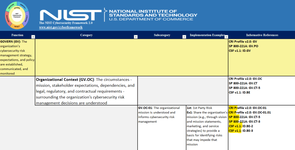 Very quickly I do want to glance over at the “Privacy Framework” tab. We won’t be spending too much time here because I’ve decided that I am going to deconstruct the VA’s FISMA and Financial Audit all the way through mapping it just to the CSF 2.0 before I do the same thing for the Privacy Framework.