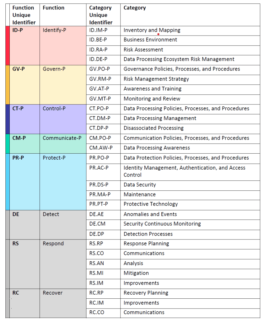 - NIST’s Privacy Framework exists because the cybersecurity framework is not sufficient enough on its own to cover data privacy concerns. Privacy risks can occur without a cybersecurity risk occurring. Just to give you an idea on how closely the CSF and Privacy Framework (PF) are related, you should know that the CSF 2.0 was published in February 2024 while PF 1.1 was just published over a year later in April 2025. They share many of the same Functions, however they have 2 new Functions (Control and Communicate) and also they’ve removed the Detect, Respond, and Recover Functions. The last 3 Functions are still included on the table because they do note organizations may choose to include these in order to further support the management of privacy risks.