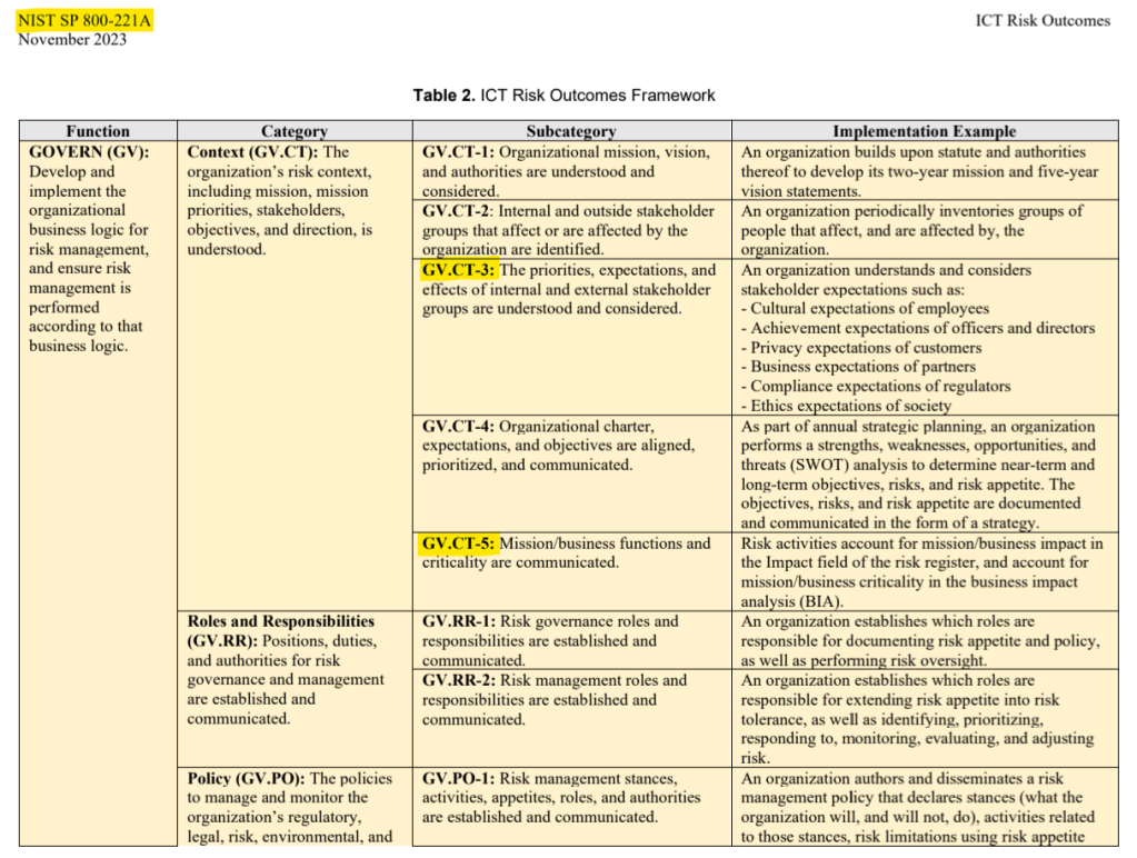 - Subcategory: describes desired cybersecurity outcomes